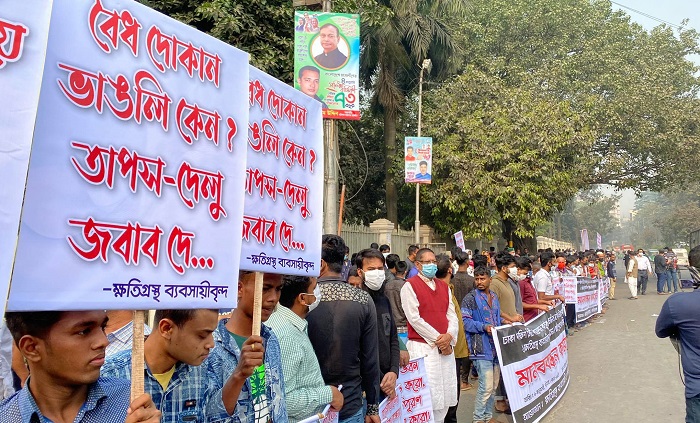 ঢাকা দক্ষিণ সিটি করপোরেশন কর্তৃক পরিচালিত অবৈধ দোকানদারদের উচ্ছেদে ক্ষতিগ্রস্ত ব্যবসায়ীদের ক্ষতিপূরণ ও পুনর্বাসনের দাবিতে মানববন্ধন করেছেন ক্ষতিগ্রস্ত ব্যবসায়ী ও তাদের পরিবারের সদস্যরা। আজ শনিবার (০৯ জানুয়ারি) বেলা ১১টায় হাইকোর্ট এলাকার কদম ফোয়ারার সামনে মানববন্ধন শুরু হয়। সেখানে দক্ষিণ সিটির সাবেক মেয়র সাঈদ খোকনও অংশ নিয়ে এসব কথা বলেন।