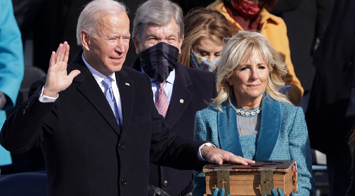 যুক্তরাষ্ট্রের প্রধান বিচারপতি জন রবার্টস তাকে শপথ বাক্য পাঠ করান। শপথ অনুষ্ঠানে জাতীয় সংগীত পরিবেশন করেন লেডি গাগা।
