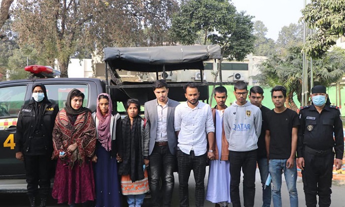 গ্রেপ্তারকৃতরা হলেন- শামিমা বেগম, রেশমা খাতুন, আকলিমা আক্তার ওরফে আঁখি, রায়হান হোসেন, তুষার রহমান, শ্রাবন হোসেন, সাকিব ইসলাম, জাকির হোসেন ও সোহেল মিয়া।
