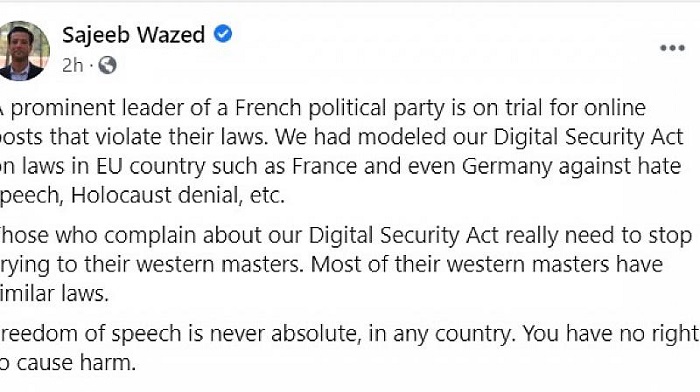 নিজের ভেরিফায়েড ফেসবুক পেজে ইংরেজি ভাষায় দেওয়া পোস্টে সজীব ওয়াজেদ জয় বলেছেন, অনলাইনে এক পোস্টের মাধ্যমে আইন লঙ্ঘনের অভিযোগে ফ্রান্সে প্রধান সারির এক রাজনৈতিক নেতাকে বিচারের মুখোমুখি করা হয়েছে। ফ্রান্স এবং এমনকি জার্মানির মতো ইউরোপীয় দেশগুলোর অনুকরণে আমরা ডিজিটাল নিরাপত্তা করেছি। এই দেশগুলো ঘৃণামূলক বক্তব্য, হলোকাস্টকে অস্বীকারের বিরুদ্ধে ডিজিটাল আইন করেছে।