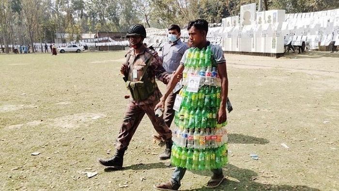 বোতল প্রতীক গায়ে জড়িয়ে কেন্দ্রের বাইরে ঘুরছিলেন যুবক। হঠাৎ ম্যাজিস্ট্রেটের কাছে ধরা পড়লেন। তবে কিছুক্ষণ গাড়িতে বসিয়ে রাখার পর ছেড়ে দেওয়া হয় তাকে। যুবক শরিফুল ইসলাম হেলাই গ্রামের আনসার আলীর ছেলে।