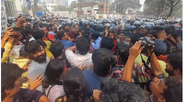 লেখক মুশতাক আহমেদের মৃত্যুর তদন্ত ও বিচার, মৃত্যুর ঘটনার প্রতিবাদ করতে গিয়ে গ্রেফতার হওয়াদের মুক্তি এবং ডিজিটাল নিরাপত্তা আইন বাতিলের দাবিতে বামপন্থী ছাত্রসংগঠনগুলোর স্বরাষ্ট্র মন্ত্রণালয় ঘেরাও কর্মসূচিতে বাধা দিয়েছে পুলিশ। এখন সচিবালয় সংলগ্ন ডিপিডিসি ভবনের সামনে পুলিশের সঙ্গে মুখোমুখি অবস্থানে আছেন তারা।