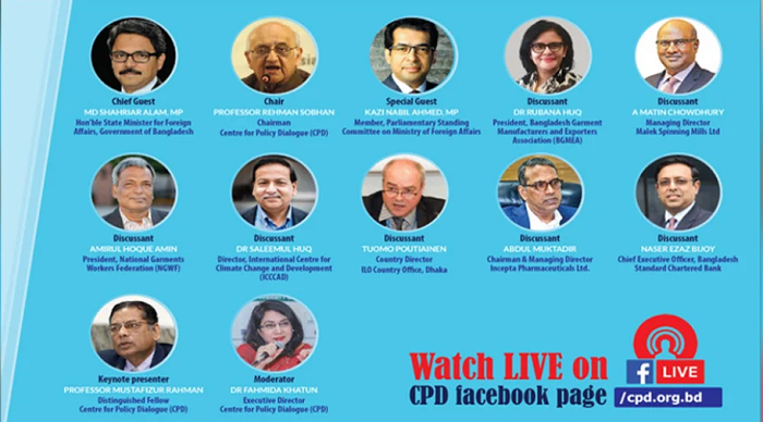বৃহস্পতিবার বেসরকারি গবেষণা সংস্থা সিপিডি আয়োজিত এক সংলাপে বক্তারা এই মতামত দেন। ‘এলডিসি গ্রুপ থেকে বের হওয়া: অর্থনীতির গতি ধরে রাখার কৌশল’ শিরোনামের সংলাপে প্রধান অতিথি ছিলেন পররাষ্ট্র প্রতিমন্ত্রী শাহরিয়ার আলম। অনলাইনে আয়োজিত অনুষ্ঠান সঞ্চালনা করেন সিপিডির নির্বাহী পরিচালক ফাহমিদা খাতুন।