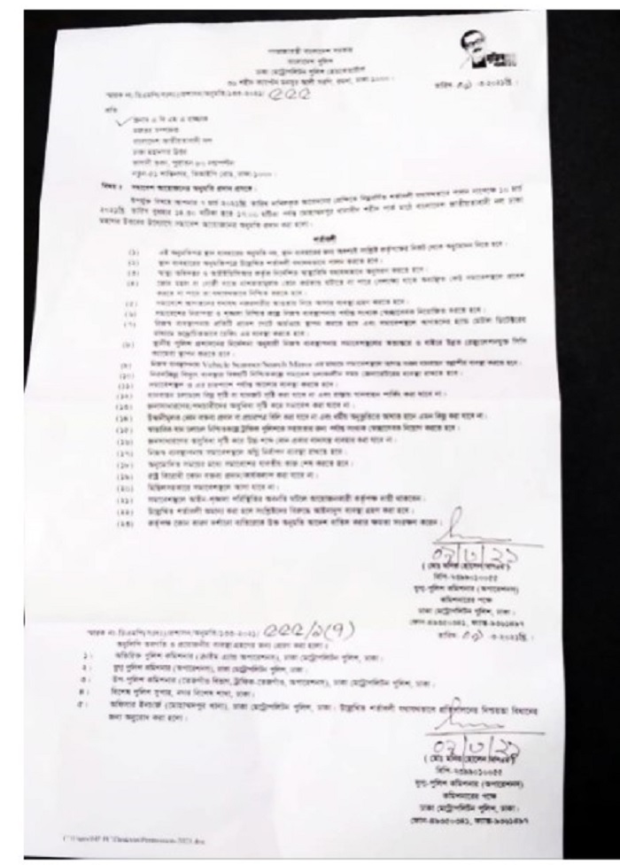 সেই আবেদনের প্রেক্ষিতে ডিএমপি ২৩টি শর্ত দিয়ে বিএনপিকে সমাবেশ করার অনুমতি দিল।