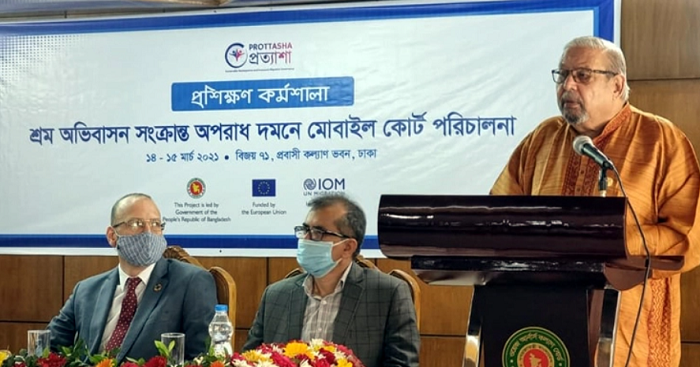 নির্বাহী ম্যাজিস্ট্রেটদের জন্য ‘শ্রম অভিবাসন সংক্রান্ত অপরাধ দমনে মোবাইল কোর্ট পরিচালনা’ শীর্ষক দুই দিনব্যাপী এই কর্মশালার আয়োজন করে প্রবাসীকল্যাণ মন্ত্রণালয় ও ইন্টারন্যাশনাল অর্গানাইজেশন ফর মাইগ্রেশন (আইওএম)। এতে সভাপতিত্ব করেন প্রবাসীকল্যাণ মন্ত্রণালয়ের সচিব ড. আহমেদ মুনিরুছ সালেহীন।