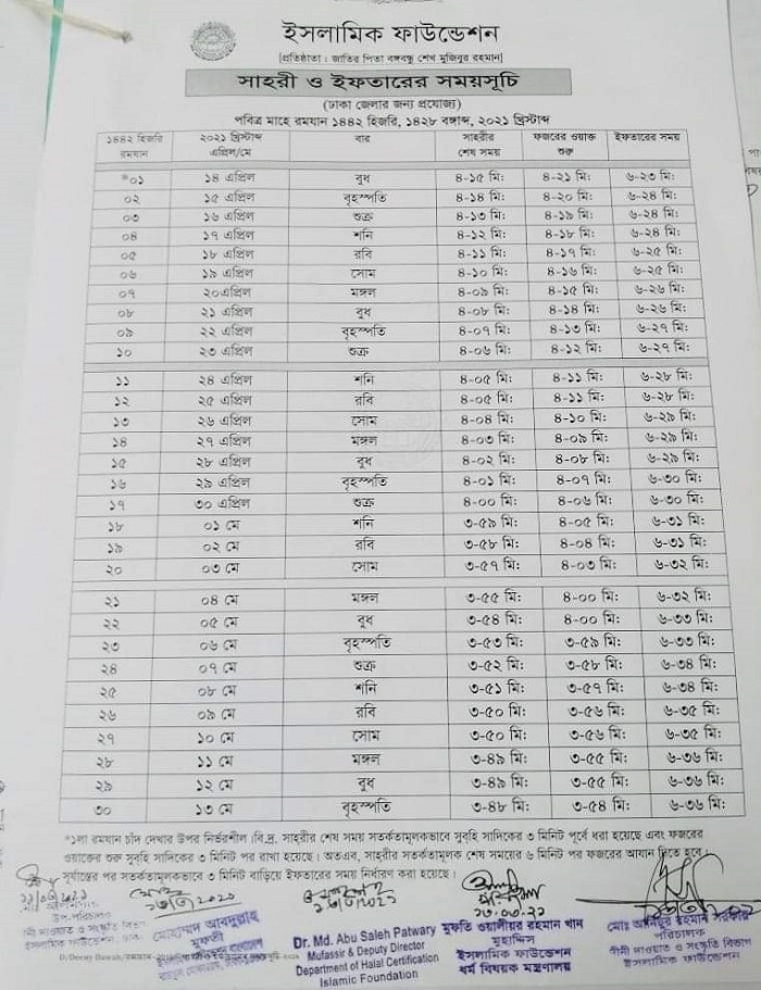 গত ১৩ মার্চ ইসলামিক ফাউন্ডেশন ১৪৪২ হিজরির রমজান মাসের সেহরি ও ইফতারের এই সময়সূচি চূড়ান্ত করে। এই সময়সূচি আজ রোববার (২১ মার্চ) গণমাধ্যমে পাঠিয়েছে ফাউন্ডেশন।