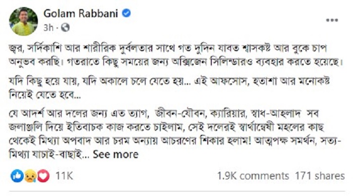 আজ শনিবার (০৩ এপ্রিল) রাব্বানী তার ভেরিফায়েড ফেসবুক আইডিতে তার বর্তমান অবস্থার কথা তুলে ধরেছেন। বলেছেন পাওয়া না-পাওয়ার আক্ষেপের কথা। আবেগঘন স্ট্যাটাসে গোলাম রাব্বানী লিখেন, ‘জ্বর, সর্দি-কাশি আর শারীরিক দুর্বলতার সাথে গত দুদিন যাবৎ শ্বাসকষ্ট আর বুকে চাপ অনুভব করছি। গতরাতে কিছু সময়ের জন্য অক্সিজেন সিলিন্ডারও ব্যবহার করতে হয়েছে।’
