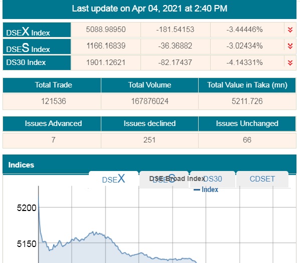 ডিএসইতে আজ প্রধান মূল্যসূচক ডিএসইএক্স ৩ দশমিক ৪৪ পয়েন্ট বা ১৮১ দশমিক ৫৪ পয়েন্ট কমে ৫ হাজার ৮৮ দশমিক ৯৮ পয়েন্টে নেমে এসেছে। এটি গত ৪ মাসের মধ্যে এই সূচকের সর্বনিম্ন অবস্থান। এর আগে গত বছরের ৯ ডিসেম্বর সূচকটির অবস্থান ছিল ৫ হাজার ৬৯ পয়েন্ট।