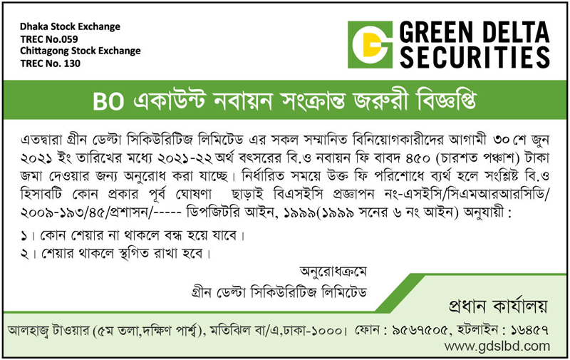 গ্রীন ডেল্টা সিকিউরিটিজ লিঃ এর বিও একাউন্ট নবায়ন ২০২১ সংক্রান্ত জরুরী বিজ্ঞপ্তি প্রকাশ 2021-06-08 10:40:04 গ্রীন ডেল্টা সিকিউরিটিজ লিঃ এর বিও একাউন্ট নবায়ন ২০২১ সংক্রান্ত জরুরী বিজ্ঞপ্তি Tweet