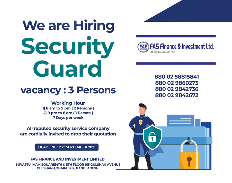 Advertisement of Security Guard for FAS Finance & Investment Limited. প্রকাশ 2021-09-19 18:13:37 Advertisement of Security Guard for FAS Finance & Investment Limited. Tweet
