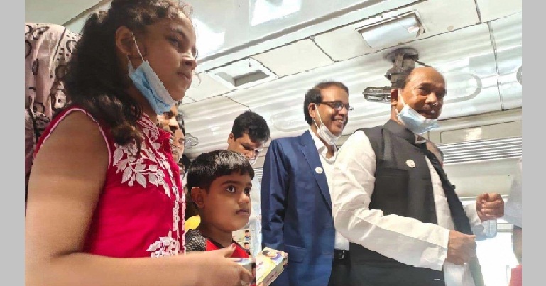 সোমবার (১৮ অক্টোবর) সকালে কমলাপুর রেলওয়ে স্টেশন থেকে পঞ্চগড়ের উদ্দেশ্যে ছেড়ে যাওয়া একতা এক্সপ্রেস ট্রেনে বাবা মা বা আত্মীয় স্বজনের সঙ্গে ভ্রমণরত শিশুদের মধ্যে তিনি উপহার সমগ্রী বিতরণ করেন।