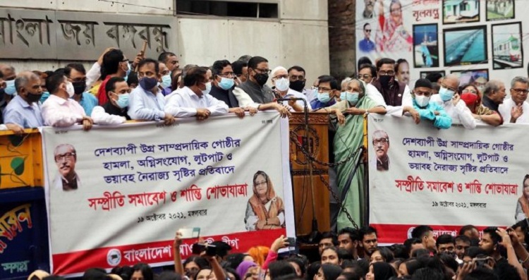 দেশের বিভিন্ন স্থানে সাম্প্রদায়িক হামলার প্রতিবাদে রাজধানীতে ‘সম্প্রীতি সমাবেশ ও শান্তি মিছিল’ করেছে আওয়ামী লীগ। এতে দলটির নেতাকর্মী ছাড়াও বিভিন্ন শ্রেণির মানুষও অংশ নিয়েছেন। এদিকে শান্তি সমাবেশের মধ্য দিয়ে প্রায় দুই বছর পর মাঠে নামলো আওয়ামী লীগের নেতাকর্মীরা। এই কর্মসূচির কারণে রাজধানী জুড়ে যানজটের সৃষ্টি হয়েছে।