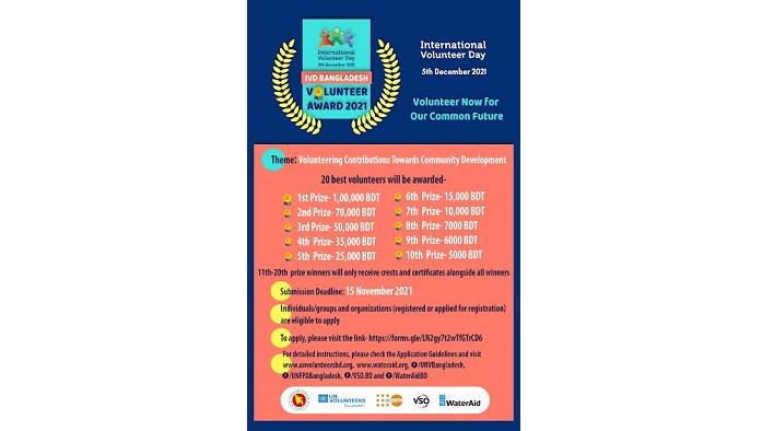 স্থানীয় সরকার, পল্লী উন্নয়ন ও সমবায় মন্ত্রণালয়, ইউএনভি বাংলাদেশ, ওয়াটারএইড বাংলাদেশ, ভিএসও বাংলাদেশ ও ইউএনএফপিএ বাংলাদেশের যৌথ উদ্যোগে আয়োজন করা হয়েছে ‘আইভিডি বাংলাদেশ ভলান্টিয়ার অ্যাওয়ার্ড-২০২১’।