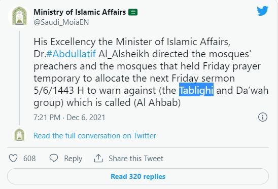 তাবলিগ জামাতকে ‘সন্ত্রাসবাদের অন্যতম দরজা’ আখ্যা দিয়ে নিষিদ্ধ করেছে সৌদি আরব। সৌদি আরবের ‘ইসলামি বিষয়ক মন্ত্রী ড. আব্দুল লাতিফ আলশেখ এ বিষয়ে টুইট করেছেন। টুইট বার্তায় তিনি যেসব মসজিদে জুমার নামাজ হয় সেসব মসজিদকে অস্থায়ীভাবে পরের জুমার খুতবায় তাবলীগ জামাতের বিরুদ্ধে সতর্ক করতে নির্দেশ দিয়েছেন’।