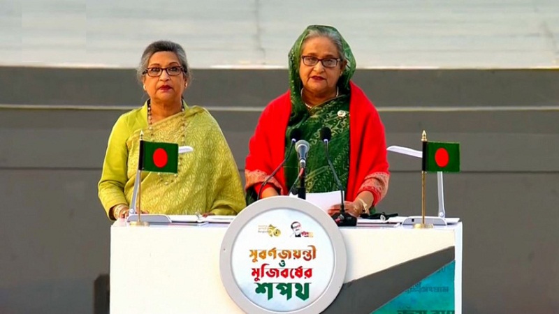 জাতির পিতা বঙ্গবন্ধু শেখ মুজিবুর রহমানের জন্মশতবার্ষিকী এবং বাংলাদেশের স্বাধীনতা সুবর্ণজয়ন্তী উদ্যাপন অনুষ্ঠানে দেশব্যাপী সর্বস্তরের মানুষকে শপথ বাক্য পাঠ করিয়েছেন প্রধানমন্ত্রী শেখ হাসিনা।