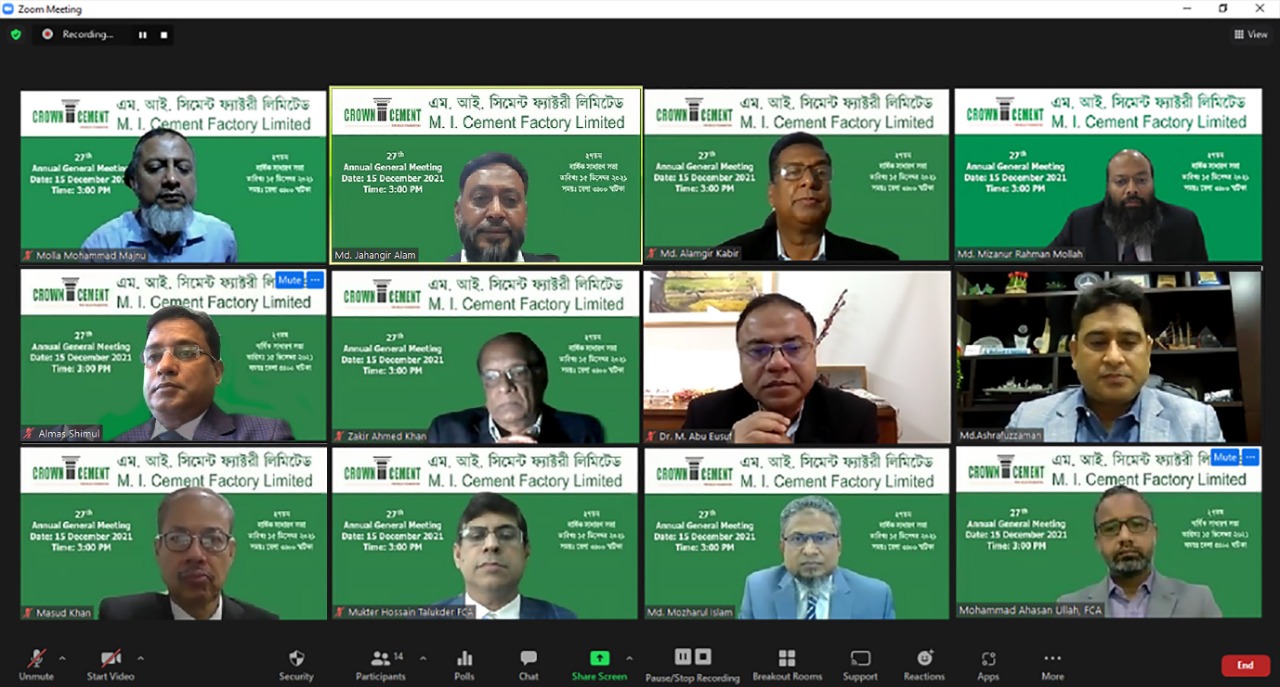এজিএম এ সভাপতিত্ব করেন এম. আই. সিমেন্ট ফ্যাক্টরী লিমিটেড এর চেয়ারম্যান জনাব মোহাম্মদ জাহাঙ্গীর আলম। উক্ত সভায় শেয়ারহোল্ডারগণ ৩০ জুন ২০২১ তারিখে সমাপ্ত বছরের আর্থিক বিবরণী, নিরীক্ষক ও পরিচালকমন্ডলীর প্রতিবেদন, পরিচালকবৃন্দের নির্বাচন, বর্তমান দুইজন স্বতন্ত্র পরিচালকের পুনঃনিয়োগ এবং ৩০ জুন ২০২২ তারিখে সমাপ্তব্য বছরের জন্য বহিঃনিরীক্ষক ও কর্পোরেট গভর্ন্যান্স নিরীক্ষক নিয়োগ এবং তাদের পারিশ্রমিক নির্ধারণও অনুমোদিত হয়। এছাড়াও বিশেষ আলোচ্য সূচী হিসেবে কোম্পানির নাম “এম. আই. সিমেন্ট ফ্যাক্টরী লিমিটেড” হতে “ক্রাউন সিমেন্ট পিএলসি” তে পরিবর্তন করার প্রস্তাবও অনুমোদিত হয়।