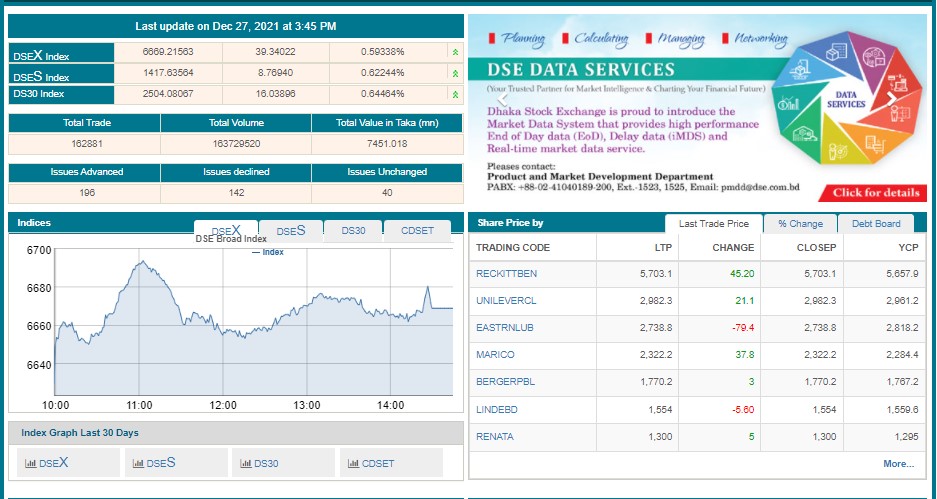 ডিএসইতে ৩৭৮টি প্রতিষ্ঠানের শেয়ার ও ইউনিট লেনদেন হয়েছে। এসব প্রতিষ্ঠানের মধ্যে ১৯৬টির বা ৫১.৮৫ শতাংশ শেয়ার ও ইউনিটের দর বেড়েছে। দর কমেছে ১৪২টির বা ৩৭.৫৭ শতাংশের এবং ৪০টি বা ১০.৫৮ শতাংশ প্রতিষ্ঠানের শেয়ার ও ইউনিট দর অপরিবর্তিত রয়েছে।