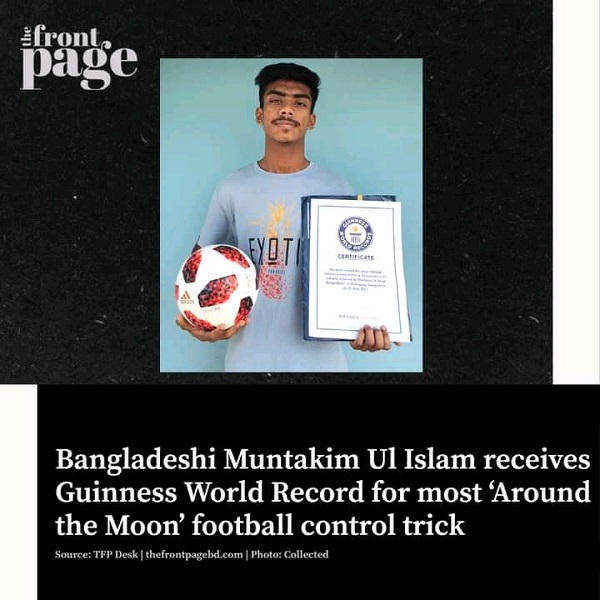 হাতের স্পর্শ ছাড়া মাথার চারপাশে ফুটবল ঘুরানোকে গিনেস কর্তৃপক্ষের ভাষায় বলা হয় ‘অ্যারাউন্ড দ্য মুন ফুটবল কন্ট্রোল ট্রিকস ইন থার্টি সেকেন্ডস’। ৩০ সেকেন্ডে ২৭ বার এ কীর্তি করে গিনেস ওয়ার্ল্ড রেকর্ডস বুকে নিজের নাম তুলেছেন বাংলাদেশের চট্টগ্রামের তরুণ মুনতাকিম উল ইসলাম।