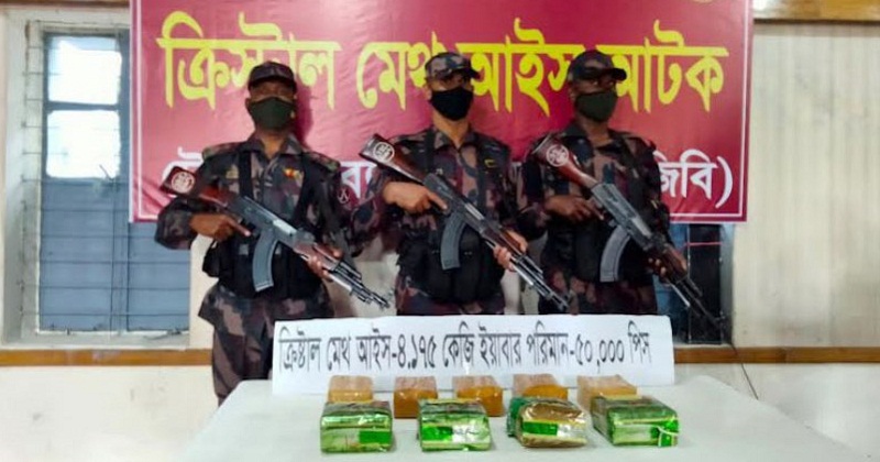 কক্সবাজারের টেকনাফ থানাধীন নাফ নদের জালিয়ার দ্বীপ এলাকা থেকে চার কেজি ১৭৫ গ্রাম ভয়ঙ্কর মাদক আইস (ক্রিস্টাল মেথ) উদ্ধার করেছে বর্ডার গার্ড বাংলাদেশ (বিজিবি)। এগুলোর আনুমানিক মূল্য প্রায় ২২ কোটি ৩৭ লাখ ৫০ হাজার টাকা। এ সময় ৫০ হাজার পিস ইয়াবাও উদ্ধার করা হয়।