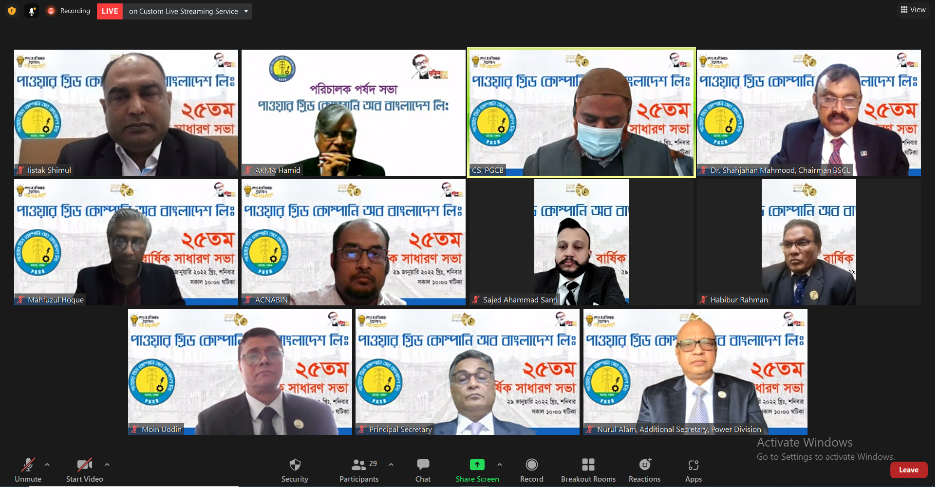 পাওয়ার গ্রিড কোম্পানি অব বাংলাদেশ লিঃ (পিজিসিবি) এর ২৫তম বার্ষিক সাধারণ সভা অনুষ্ঠিত হয়েছে। করোনা ভাইরাস সৃষ্ট পরিস্থিতির কারণে আজ শনিবার (২৯ জানুয়ারি) গতবারের ন্যায় অনলাইনে কোম্পানিটির বার্ষিক সাধারণ সভা অনুষ্ঠিত হয়েছে।