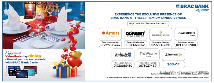 তিনি আরও বলেন, “আমারি ঢাকা, ডোরিন হোটেলস অ্যান্ড রিসোর্টস, ইন্টারকন্টিনেন্টাল ঢাকা, লে মেরিডিয়ান ঢাকা, রেডিসন ব্লু ঢাকা ওয়াটার গার্ডেন, দ্যা ওয়েস্টিন ঢাকা ও গ্লোরিয়া জিনস কফিস ইত্যাদি সহ সেরা ডাইনিং ভেন্যুতে ব্র্যাক ব্যাংক এর বিশেষ ব্র্যান্ডিং উপস্থিতি থাকছে।” এই অফার সম্পর্কে আরো বিস্তারিত জানতে ২৪-ঘন্টা কল করুন ১৬২২১ নম্বরে এবং বিস্তারিত জানা যাবে ব্যাংকের ওয়েবসাইটে : https://www.bracbank.com/valentines_day_2022/