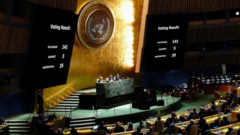১৯৩ সদস্য দেশের পরিষদে ওই প্রস্তাবের পক্ষের সমর্থন দিয়েছে ১৪১ দেশ। আর বিপক্ষে ভোট পড়েছে রাশিয়াসহ ৫ দেশের। বাকি দেশগুলো হলো- বেলারুশ, ইরিত্রিয়া, উত্তর কোরিয়া ও সিরিয়া।