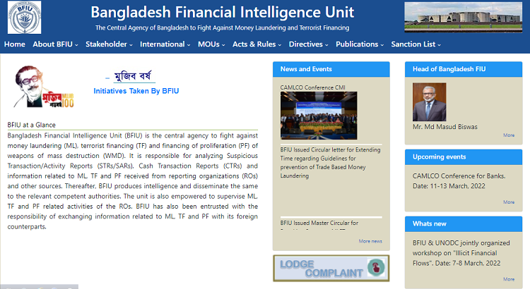 মানিলন্ডারিং ও সন্ত্রাসে অর্থায়ন প্রতিরোধ বিষয়ক কেন্দ্রীয় সংস্থা বাংলাদেশ ফাইন্যান্সিয়াল ইন্টেলিজেন্স ইউনিটের স্বতন্ত্র ওয়েবসাইট জনসাধারণের জন্য উম্মুক্ত করা হয়েছে। সোমবার (০৭ মার্চ) বাংলাদেশ ব্যাংকের এক সংবাদ বিজ্ঞপ্তিতে এই তথ্য জানানো হয়েছে। বাংলাদেশ ব্যাংকের জাহাঙ্গীর আলম কনফারেন্স হলে বিএফআইইউ এর প্রধান কর্মকর্তা মো. মাসুদ বিশ্বাস ওয়েবসাইটটির শুভ উদ্বোধন ঘোষণা করেন।