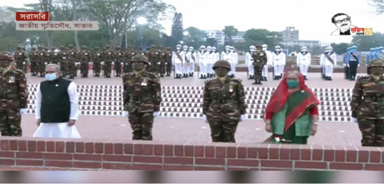 শনিবার (২৬ মার্চ) ভোরে ৫টা ৫৫ মিনিটে জাতীয় স্মৃতিসৌধের বেদীতে প্রথমে রাষ্ট্রপতি মো. আবদুল হামিদ এবং পরে প্রধানমন্ত্রী শেখ হাসিনা ফুল দিয়ে বীর শহীদদের প্রতি শ্রদ্ধা জানান। এসময় তারা কিছুক্ষণ নীরবে দাঁড়িয়ে থাকেন।