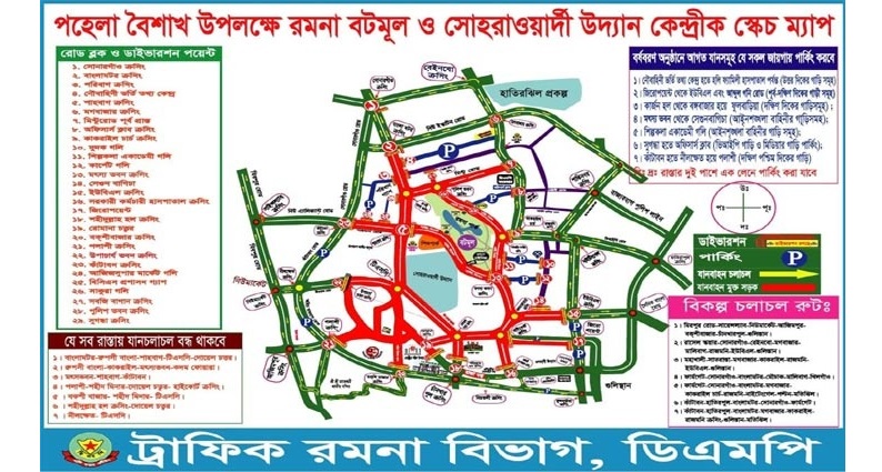 পুলিশ জানিয়েছে, রমনা বটমূল, সোহরাওয়ার্দী উদ্যান, শাহবাগ, চারুকলা ইনস্টিটিউট, ঢাকা বিশ্ববিদ্যালয় ক্যাম্পাস, বাংলা একাডেমি চত্বর, শিশু একাডেমি, হাইকোর্ট এলাকাসহ আশপাশের এলাকায় জনসমাগমকে কেন্দ্র করে সুষ্ঠু যানবাহন চলাচলের লক্ষ্যে বিশেষ ব্যবস্থা নিয়েছে ট্রাফিক পুলিশ। এজন্য কিছু সড়কে যান চলাচল বন্ধ থাকবে। তবে, বিকল্প সড়ক ব্যবহার করা যাবে।