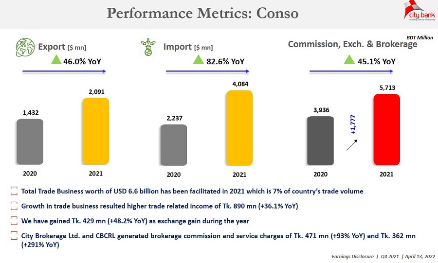 অন্যদিকে করোনার সঙ্কটের মধ্যেও আন্তর্জাতিক বাণিজ্য (আমদানি-রপ্তানি) অর্থায়ন  বেড়েছে। ২০২১ সালে সিটি ব্যাংক ৬৬০ কোটি ডলারের অর্থায়ন সুবিধা দিয়েছে আন্তর্জাতিক বাণিজ্যে, যা দেশের মোট আন্তর্জাতিক বাণিজ্যের ৭ শতাংশ। আলোচিত বছরে আমদানি বাণিজ্যে সিটি ব্যাংকের অর্থায়ন বেড়েছে ৪৬ শতাংশ, আর রপ্তানি বাণিজ্যে বেড়েছে ৮২.৬ শতাংশ।