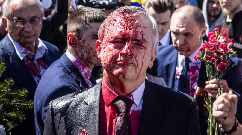 পোল্যান্ডে নিযুক্ত রাশিয়ার রাষ্ট্রদূত সের্গেই আন্দ্রেয়েভের ওপর হামলা হয়েছে। তবে তাকে শারীরিকভাবে নির্যাতন করা হয়নি, তার চোখেমুখে রক্তের মতো লাল রঙ ছুড়ে মেরেছে মানুষ।