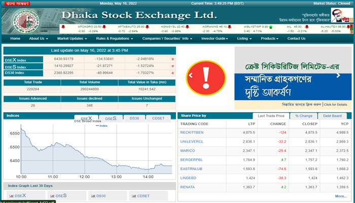অন্যদিকে, ব্যাপক পতনের কারণে এদিন ঢাকা স্টক এক্সচেঞ্জের (ডিএসই) প্রধান সূচক ডিএসইএক্স প্রায় ৯ মাস আগের অবস্থানে নেমে গেছে। অর্থাৎ ডিএসইর সূচক আবারও সাড়ে ৬ হাজার পয়েন্টের নিচে চলে এসেছে। এর আগে চলতি বছরের ৮ মর্চ ডিএসইর প্রধান সূচক ছিল ৬ হাজার ৪৭৪ পয়েন্টে। আজ ১৩৪ পয়েন্ট কমে দাঁড়িয়েছে ৬ হাজার ৪৩০ পয়েন্টে।