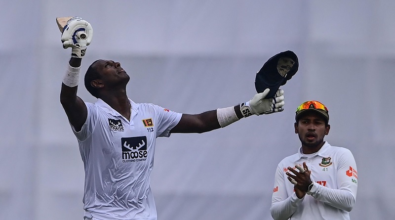 মোসাদ্দেক হোসেনের বলে লং অনে ঠেলে দিয়ে এক রান নিয়ে ম্যাজিকাল ফিগারে পৌঁছান এই ,লঙ্কান ব্যাটার। সাদা পোশাকের ক্রিকেটের এটি ম্যাথুসের ১৩তম সেঞ্চুরি। সেঞ্চুরির পর মোসাদ্দেকের বলে আরও একবার রিভিউ নিয়ে বেঁচেছেন ম্যাথুস। এলবিডব্লিউয়ের জোরালো আবেদনে সাড়া দিয়ে আম্পায়ার আউট দিয়েছিলেন। যদিও রিপ্লেতে দেখা যায় বল প্যাডে লাগার আগে ব্যাটের ছোঁয়া লেগেছে।