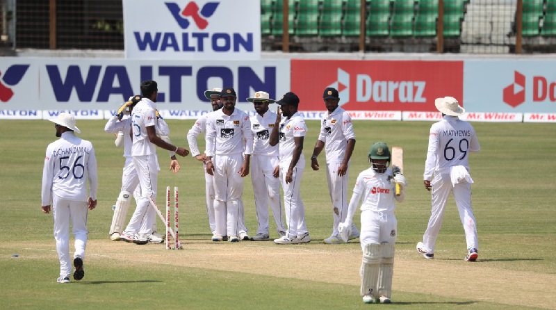 চতুর্থ দিনের শেষ বিকেলে ব্যাটিং করতে নেমে প্রথম ইনিংসের পুনরাবৃত্তি ঘটান বাংলাদেশি ব্যাটাররা। এরপর আবারও মুশফিকুর রহিম-লিটন দাসের ব্যাটে ঘুড়ে দাঁড়ায় বাংলাদেশ। কিন্তু শেষ দিনের সকালেই ফিরে যান মুশফিক। সেই ধাক্কা সামলে ভালোভাবেই এগোচ্ছিল বাংলাদেশ। তবে দ্বিতীয় সেশনে গিয়েই যেন সব এলোমেলো হয়ে যায়। বাংলাদেশ অলআউট হয় ১৬৯ রানে। আর তাতে লঙ্কানদের জন্য লক্ষ্য দাঁড়ায় মাত্র ২৯ রানের।