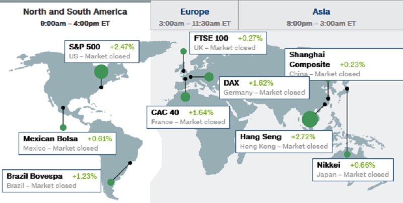 গতকাল শুক্রবার যুক্তরাষ্ট্রের পুঁজিবাজারে সব সূচকের বড় উল্লম্ফন ঘটেছে। যুক্তরাষ্ট্রের পাশাপাশি ইউরোপের বাজারও ছিল চাঙ্গা। জাপান, হংকং, চীন, ভারতের বাজারেও মূল্যসূচক ছিল উর্ধমুখী।