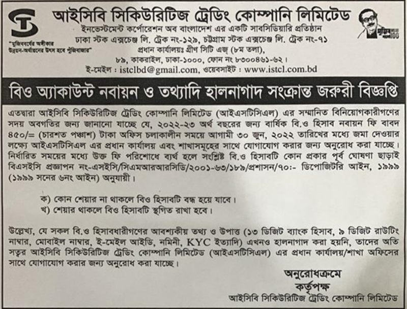 আইসিবি সিকিউরিটিজ ট্রেডিং কোম্পানি লিমিটেড এর বিও একাউন্ট নবায়ন সংক্রান্ত জরুরী বিজ্ঞপ্তি প্রকাশ 2022-06-01 10:24:57 আইসিবি সিকিউরিটিজ ট্রেডিং কোম্পানি লিমিটেড এর বিও একাউন্ট নবায়ন সংক্রান্ত জরুরী বিজ্ঞপ্তি Tweet