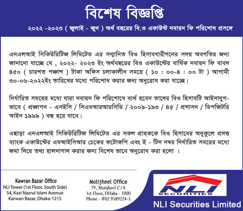 এনএলআই সিকিউরিটিজ লিমিটেড এর বিও হিসাব নবায়ন সংক্রান্ত বিজ্ঞপ্তি প্রকাশ 2022-06-09 19:08:09 এনএলআই সিকিউরিটিজ লিমিটেড এর বিও হিসাব নবায়ন সংক্রান্ত বিজ্ঞপ্তি Tweet
