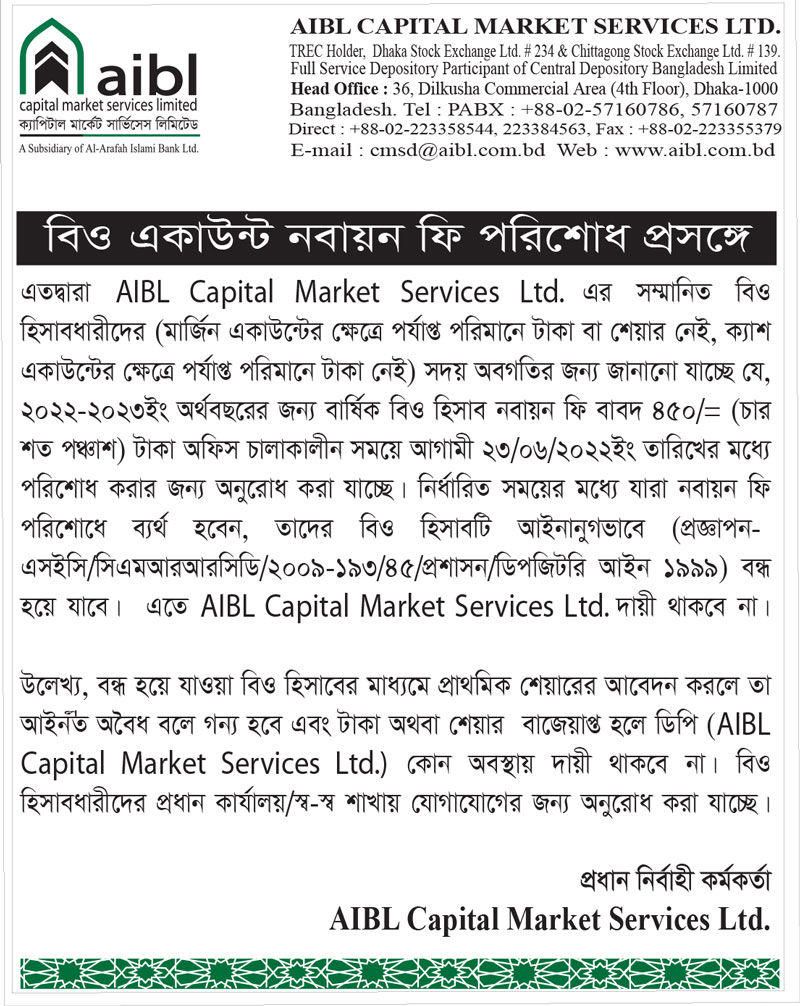 এআইবিএল ক্যাপিটাল মার্কেট সার্ভিসেস লিমিটেড এর বিও একাউন্ট নবায়ন সংক্রান্ত বিজ্ঞপ্তি প্রকাশ 2022-06-12 10:50:50 এআইবিএল ক্যাপিটাল মার্কেট সার্ভিসেস লিমিটেড এর বিও একাউন্ট নবায়ন সংক্রান্ত বিজ্ঞপ্তি Tweet
