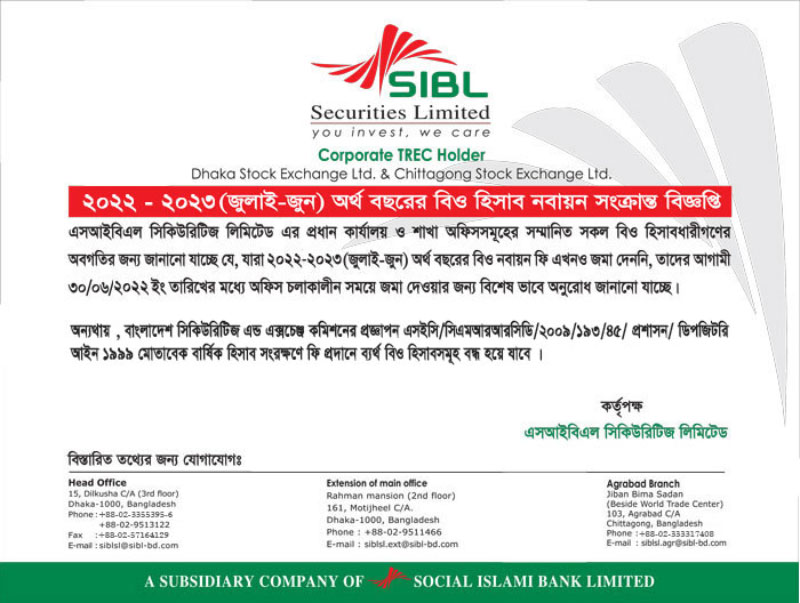 এসআইবিএল সিকিউরিটিজ লিমিটেড এর বিও হিসাব নবায়ন সংক্রান্ত বিজ্ঞপ্তি প্রকাশ 2022-06-14 10:57:13 এসআইবিএল সিকিউরিটিজ লিমিটেড এর বিও হিসাব নবায়ন সংক্রান্ত বিজ্ঞপ্তি Tweet