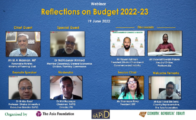 রোববার (১৯ জুন) ইকোনমিক রিপোর্টার্স ফোরাম, গবেষণা প্রতিষ্ঠান রিসার্স এন্ড পলিসি ইনটিগ্রেশন ফর ডেভেলপমেন্ট (রেপিড) ও দ্য এশিয়া ফাউন্ডেশনের উদ্যোগে আয়োজিত ‘রিফ্লেকশন অন বাজেট ২০২২-২৩’ শীর্ষক ওয়েবিনারে প্রধান অতিথির বক্তব্যে তিনি এসব কথা বলেন।