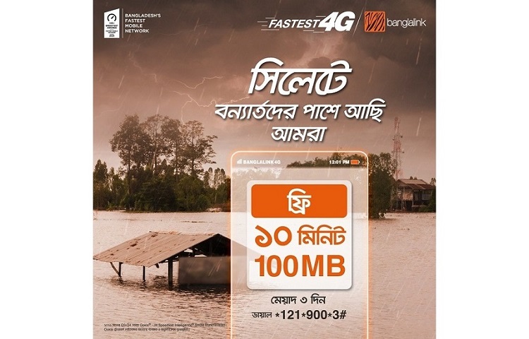 সিলেটে বন্যা দুর্গতদের যোগাযোগের জন্য জরুরী প্রয়োজনে ১০ মিনিট ফ্রি টক টাইম ও ১০০ মেগাবাইট ডেটা সুবিধা দিয়েছে বাংলালিংক। গ্রাহকরা যে কোনো লোকাল নাম্বারে কল করতে এই ফ্রি মিনিট তিনদিন ব্যবহার করতে পারবেন।