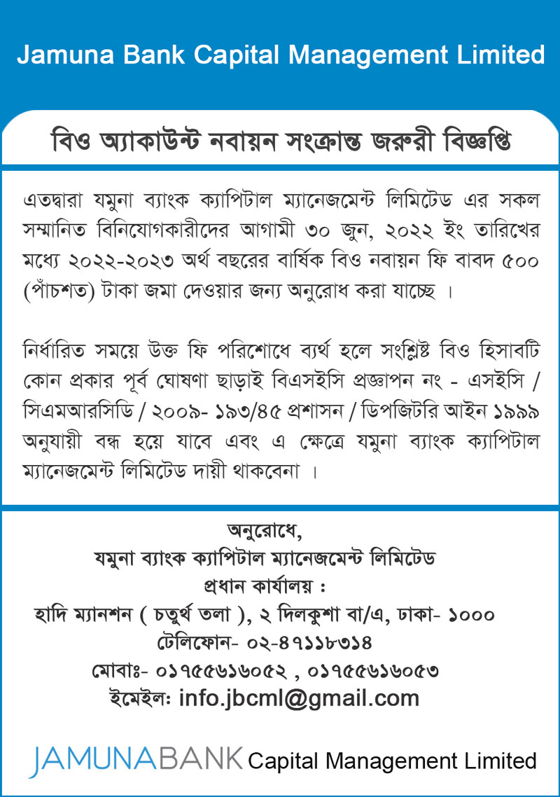 যমুনা ব্যাংক ক্যাপিটাল ম্যানেজমেন্ট লিমিটেড এর বিও অ্যাকাউন্ট নবায়ন সংক্রান্ত জরুরী বিজ্ঞপ্তি প্রকাশ 2022-06-26 17:50:45 যমুনা ব্যাংক ক্যাপিটাল ম্যানেজমেন্ট লিমিটেড এর বিও অ্যাকাউন্ট নবায়ন সংক্রান্ত জরুরী বিজ্ঞপ্তি Tweet