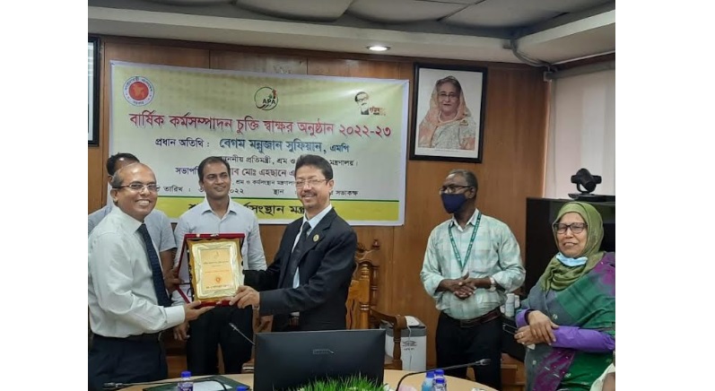২০২০-২০২১ অর্থবছরের বার্ষিক কর্মসম্পাদন চুক্তি (এপিএ) বাস্তবায়নে সর্বোচ্চ নম্বর পাওয়ায় কলকারখানা ও প্রতিষ্ঠান পরিদর্শন অধিদপ্তর (ডাইফ)-কে সম্মাননা প্রদান করেছে শ্রম ও কর্মসংস্থান মন্ত্রণালয়।