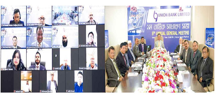ইউনিয়ন ব্যাংক লিমিটেডের ৯ম বার্ষিক সাধারণ সভা (এজিএম) অনুষ্ঠিত হয়েছে। ব্যাংকের প্রধান কার্যালয়ে ভিডিও কনফারেন্সে মাধ্যমে এ সভা অনুষ্ঠিত হয়। এতে সভাপতিত্ব করেন ব্যাংকের চেয়ারম্যান আহসানুল আলম। এজিএমে ব্যাংকের পরিচালক ও শেয়ারহোল্ডাররা অংশ গ্রহণ করেন।