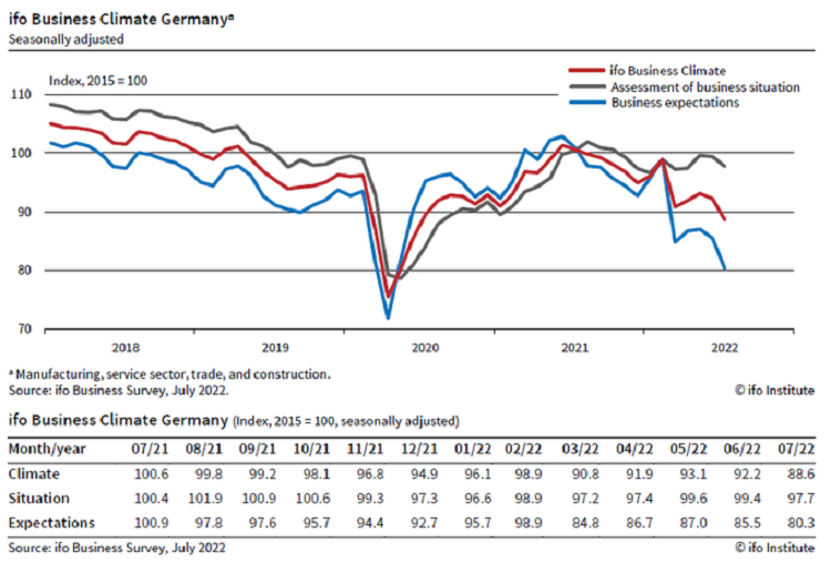 অপরদিকে,ব্যবসায়িক আবহ মানদণ্ডেরও অবনতি হয়েছে। জুলাইয়ে (২০২২) সূচক পড়ে ৮৮.৬ শতাংশ নেমে এসেছে যা জুনে (২০২২) ছিল ৯২.২ শতাংশ। সেই সঙ্গে ব্যবসায়িদের প্রত্যাশারও অবনতি হয়েছে। এবছর জুনে মানদণ্ড সূচক ৮৫.৫ থাকলেও জুলাইয়ে এসে সেটা কমে দাঁড়িয়েছে ৮০.৩ শতাংশে। এই তথ্যানুসারে ব্যবসায়িদের মধ্যে হতাশার মাত্রা বেড়েছে।