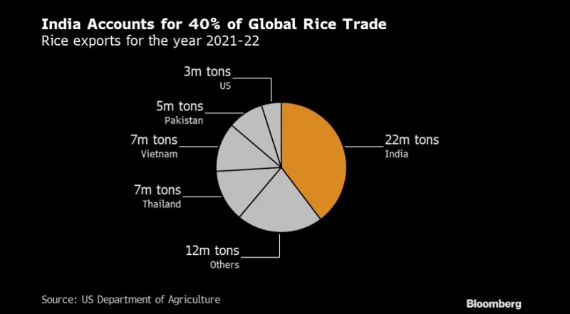 মার্কিন যুক্তরাষ্ট্রের কৃষি মন্ত্রণালয়ের সূত্রের উল্লেখ করে ব্লুমবার্গ ২০২১-২২ বছরের এক তথ্যচিত্র (পাইচার্ট) প্রকাশ করেছে। সেখানে দেখা যায়, শীর্ষ চাউল রফতানিরক দেশের তালিকায় থাকা ভারত ২২ মিলিয়ন টন চাউল যোগান দিয়ে থাকলেও থাইল্যান্ড এবং ভিয়েতনাম যোগান দিয়ে থাকে ৭ মিলিয়ন টন করে। আর পাকিস্তান ও মার্কিন যুক্তরাষ্ট্র যোগান দিয়ে থাকে যথাক্রমে ৫ মিলিয়ন ও ৩ মিলিয়ন টন করে।