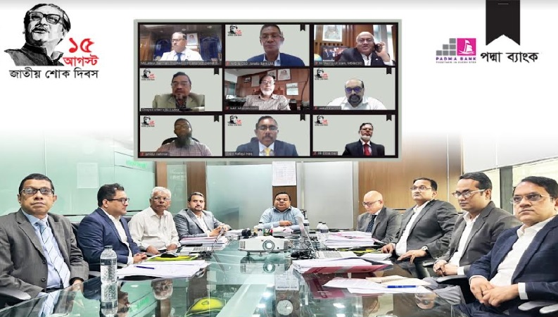 পদ্মা ব্যাংক লিমিটেডের চেয়ারম্যান চৌধুরী নাফিজ সরাফাতের সভাপতিত্বে শোক প্রস্তাব পেশ করেন ব্যাংকের ব্যবস্থাপনা পরিচালক ও প্রধান নির্বাহী কর্মকর্তা তারেক রিয়াজ খান। আলোচনায় পরিচালকগণ বঙ্গবন্ধু শেখ মুজিবুর রহমানের জীবন, কর্ম ও অর্জন এবং দেশের প্রতি তাঁর অবদানের বিষয়ে উল্লেখ করেন। সেই সঙ্গে পরিচালকগণ বঙ্গমাতা ফজিলাতুন নেছা মুজিব-সহ ১৫ আগস্টের সব শহীদদের প্রতি গভীর শ্রদ্ধা জ্ঞাপন করেন।