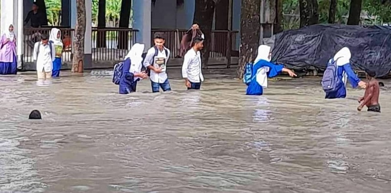 এদিকে কমলনগর উপজেলার চরফলকন ইউনিয়নের লুধুয়া বাগারহাট থেকে প্রায় ২ কিলোমিটার দূরে ফলকন উচ্চ বিদ্যালয়। জোয়ারের কারণে ছুটি পেয়ে কোমর পানি মাড়িয়ে বিদ্যালয় থেকে বাড়ি ফিরতে হয়েছে শিক্ষার্থীদের। এরমধ্যে শিশু শিক্ষার্থীরা সাঁতরে বাড়ি ফিরেছে। এ অঞ্চলের শিক্ষা প্রতিষ্ঠানগুলোতে পাঠদান ব্যাহত হচ্ছে। অন্যদিকে রামগতি উপজেলার আলেকজান্ডার মাছঘাট এলেকায় জেলেরা ঘাটে ফিরেছেন। কিন্তু মাছ শিকারে ক্লান্ত শরীরে ঘাটে ফিরে তারা আরো বেশি বিপাকে পড়েছে। কূলে উঠতে হয় বুক পরিমাণ পানি অতিক্রম করে।