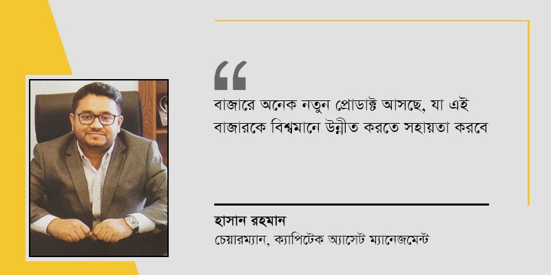 হাসান রহমানঃ আমাদের পুঁজিবাজারের সম্ভাবনা সীমাহীন। অর্থনীতির আকারের তুলনায় পুঁজিবাজার এখনো অনেক ছোট। পাশের দেশ ভারতে বাজারমূলধনের পরিমাণ জিডিপির ৮০ শতাংশের কাছাকাছি। অথচ আমরা ৩০ শতাংশের ঘরই পেরোতে পারিনি এখনো। তাই এই বাজারে প্রবৃদ্ধির অনেক সুযোগ রয়েছে। বাংলাদেশ সিকিউরিটিজ অ্যান্ড এক্সচেঞ্জ কমিশনের (বিএসইসি) বর্তমান দক্ষ নেতৃত্ব বাজারের পরিধি বাড়ানোর নিরন্তর চেষ্টা চালিয়ে যাচ্ছেন। নতুন নতুন প্রোডাক্ট বাজারে আনার উদ্যোগ নিয়েছেন তারা। ইতোমধ্যে একটি কার্যকর বন্ড মার্কেট প্রতিষ্ঠার কাজ অনেক দূর এগিয়েছে। চলতি বছরের মধ্যেই এক্সচেঞ্জ ট্রেডেড ফান্ড (ইটিএফ) চালু হবে। কমোডিটি এক্সচেঞ্জ প্রতিষ্ঠার প্রক্রিয়াও অনেক দূর এগিয়েছে। আগামী এক থেকে দেড় বছরের মধ্যে এই এক্সচেঞ্জ চালু হবে বলে আশা করা যায়। কিছুদিনের মধ্যেই চালু হবে অল্টারনেটিভ ট্রেডিং বোর্ড। সব মিলিয়ে বাজারে অনেক নতুন প্রোডাক্ট আসতে শুরু করেছে, যা এই বাজারকে বিশ্বমানে উন্নীত করতে সহায়তা করবে। তখন বাজারে বিদেশী বিনিয়োগকারীদের অংশগ্রহণ অনেক বাড়বে। শিল্প-বাণিজ্যের জন্য আরও বেশি করে মূলধন যোগান দিতে পারবে এই বাজার।