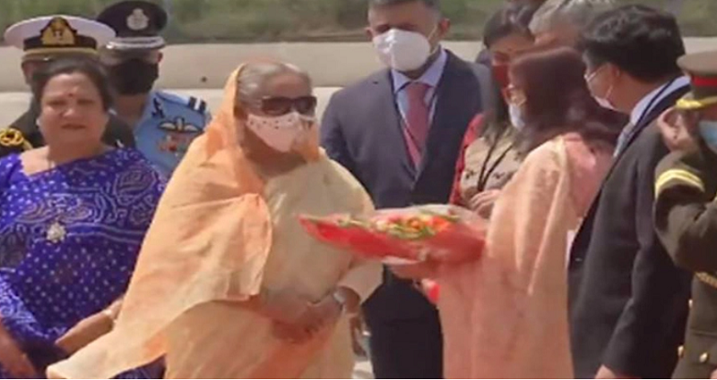 বিমানবন্দরে প্রধানমন্ত্রীকে অভ্যর্থনা জানান ভারতের রেল ও বস্ত্র প্রতিমন্ত্রী দর্শনা বিক্রম এবং ভারতে বাংলাদেশের হাইকমিশনার মুহাম্মদ ইমরান। বিমানবন্দরে পৌঁছানোর পর শেখ হাসিনাকে লাল গালিচা সংবর্ধনা দেওয়া হয়। এসময় ছয় থেকে সাত সদস্যের একটি সাংস্কৃতিক দল নৃত্য ও বাদ্যযন্ত্র বাজিয়ে বঙ্গবন্ধুকন্যাকে স্বাগত জানান।